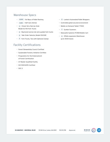 Warehouse Specs%u2219 4,500 Full Bays of Pallet Racking%u2219 5,150 Half-rack shelves%u2219 2 Drexel Very Narrow Aisle Model SLT40 Fork Trucks%u2219 2 Raymond narrow isle wire guided fork trucks%u2219 2 Yale Order Selector, Model OS030E%u2219 3 Fork Trucks, Two with Optional Clamps%u2219 2 Lantech Automated Pallet Wrappers%u2219 Controlled gated secured environment%u2219 Mobile on Demand Tablet T7000%u2219 7 Symbol Scanners%u2219 Newcastle Systems PC558 Mobile Cart%u2219 2 Offsite expansion Warehouse up to 5000 boxesFacility Certifications%u2219 Forest Stewardship Council Certified%u2219 Sustainable Forestry Initiative Certified%u2219 Programme for the Endorsement of Forest Certification%u2219 G7 Master Qualified Facility%u2219 ISO 9001:2015 Certified%u2219 SOC 2SOC for Service Organizations | Service Organizat oi nAICPA sSOC aicpa.org/soc4so%u2122DS GRAPHICS | UNIVERSAL WILDE 135 Will Drive, Canton, MA 02021 781.251.2700 dsguw.com